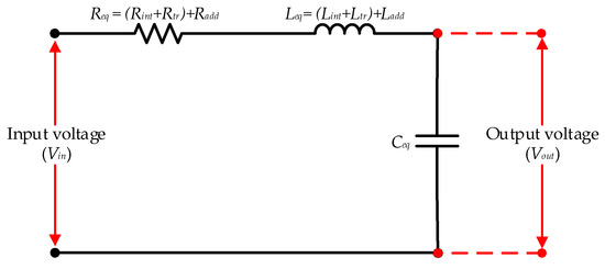From the equivalent circuit in Figure 8, the circuit can be approximated as a series resonant circuit, as expressed in Figure 9, where the equivalent resistance (Req) is the summation of the internal resistance (Rint) of the system, the total series resistance (Rtr) of the HV testing transformer, and the internal resistance (Radd) of the adjustable inductance. The equivalent inductance (Leq) is the summation of the internal inductance (Lint) of the system, the total series inductance (Ltr) of the HV testing transformer, and the internal inductance (Ladd) of the adjustable inductance. The equivalent capacitance (Ceq) is the total capacitance, including the effect of the stray capacitance of the system. The series resonant condition is described by Equation (2). If Lint and Ltr are known, the required additional inductance (Ladd) for the required testing frequency can be calculated by Equations (2) and (3). The voltage gain at the resonant condition is equivalent to the quality factor (Q) as expressed in Equation (4).