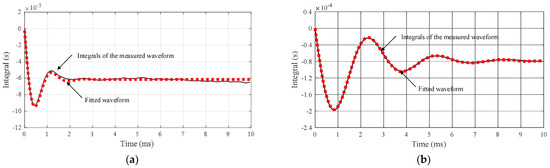 The integral waveforms of the measured waveforms in comparison with the fitted waveforms in a period (a) without the additional inductance, and (b) with the additional inductance.