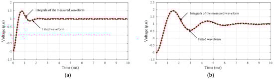With the application of the improved Prony method to the waveforms in Figure 9, the exponents can be calculated, and α1(1), α2(1), α1(2), and α2(2) are 1.8952 × 103 + j4.2783 × 103, 1.8952 × 103 − j4.2783 × 103, 5.1858 × 102 + j2.1045 × 103, and 5.1858×102 − j2.1045 × 103, respectively. With the known circuit parameters (i.e., Radd of 34.56 kΩ and Ladd of either 0 or 132.92 H on the HV side), and by transferring all impedance to the HV side, it can be determined by Equations (18)–(20), and Ls, Rs, and Ceq are 36.310 H, 137.63 kΩ, and 1.257 nF, respectively. The fitting curve using the determined parameters was in good agreement with the measured waveforms, as also shown in Figure 12.