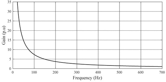 For the first objective, the required testing frequency is from 50 Hz to 200 Hz. Using Equations (2) and (3), Ladd can be calculated by Equation (21). With the required testing frequency, Ladd should be adjustable from 360 H to 8000 H on the HV side (13.52 mH to 300 mH on the LV side). The inductance range (3 mH to 300 mH on the LV side) is consistent with the preliminary selection in Section 2.2. With the known Rs and Radd of the gain of the transfer function of the input and output voltage, the gain can be calculated by Equation (4) and plotted with the required frequency, as shown in Figure 13.