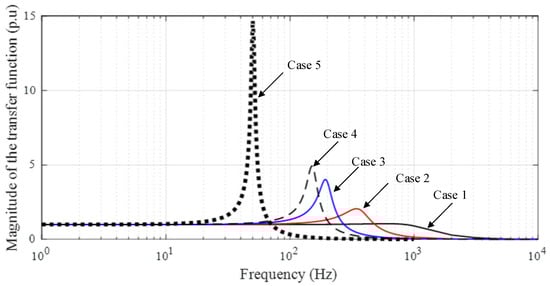 The lower the required frequency, the higher the gain. At frequencies of 50 Hz, 150 Hz, and 200 Hz, the gain is about 15, 5, and 3.5, respectively. It should be noted that the testing frequency of 50 Hz is utilized in the testing of power cables, and the proper testing frequency is in the range of 150 Hz to 200 Hz, as utilized in most VT testing cases. In Figure 14, the normalized transfer functions (Vout/Vin) in the frequency domain with different additional inductances, as shown in Table 2, are presented. The gains in Figure 13 and Figure 14 are in good agreement.