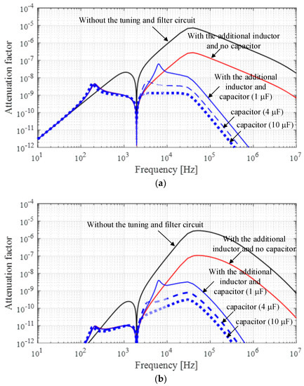 Attenuation factor at the PD port of the testing system: (a) without the band-pass filter; (b) with the band-pass filter recommended by the standard.