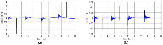 The voltage responses at the PD port caused by a 1 pC calibrator pulse current and the interference signal of the resonant circuit when the additional capacitor is connected and the output voltage is 100 kV: (a) without the band-pass filter; (b) with the band-pass filter recommended by the standard.