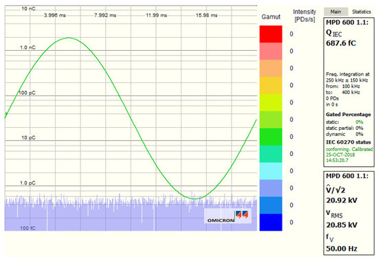 In the final experiment, a power cable was tested. The frequency of the input voltage was 50 Hz for examining the voltage gain (Vout/Vin), the quality of the testing waveform, and the background noise level. The voltage was raised to 24 kVrms for the pre-stress condition, and decreased to 20.8 kVrms for recording PD activity. A 5 pC PD pulse was also employed in the calibration process. The experimental testing voltage of about 21 kVrms is shown in Figure 22. The voltage gains at 21 kVrms and 24 kVrms were almost the same value of 12.8, which is fairly consistent with the simulation results in Figure 13 and Figure 14. The difference voltage (peak voltage/√2 = 20.92 kV and RMS voltage 20.85 kV) was 0.56%, the THDv was 0.32%, and the background noise was 0.688 pC.