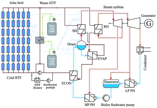 - El Hefni, B.; Soler, R. Dynamic Multi-configuration Model of a 145 MWe Concentrated Solar Power Plant with the ThermoSysPro Library (Tower Receiver, Molten Salt Storage and Steam Generator). Energy Procedia 2015, 691, 249–258. [Google Scholar] [CrossRef][Green Version]