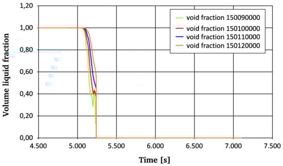 Twomey et al. [] developed a dynamic model of DSG for the PTC loop. Various feed water control loops were designed and assessed using the MODELICA language. The model was then validated using the measured data. Furthermore, they investigated different feed water control circuits. Henrion et al. [] implemented a thermodynamic type model for estimating the required backup portion for a 100 MWel hybrid solar–fossil–PTPP. The objective of this work was to predict the capacity and explore its utility for location choice within four sites. Janotte et al. [] introduced a dynamic approach for a PTC to provide an assessment of the PTC throughout the ongoing variations associated with operational environments. This evaluation includes performance data, measurement properties, and uncertainties for characteristic performance parameters. Silva et al. [] presented a non-linear dynamic three-dimensional model of a PTC under several irradiance regimes in Modelica. They combined it with a model of the heating process with the TRNSYS program. The dynamic improvement of SF outlet temperature and steady-state thermal performance in comparison with measured data are found to be in reasonable agreement, with a mean square error of 2.09 °C and 1.2%, respectively. Russo [] used molten salt in a PTPP. This model was carried out using modified RELAP5 code. This power plant includes a water/oil steam generator and a direct storage system. The model was validated according to the measured data. Furthermore, thermal–hydraulic behavior, and filling and draining procedures were analyzed. Figure 2 shows the draining phase in the collector C; collector A is emptied within approximately 1250 s, while collectors B and C are emptied in less time (approx. 250 s). Figure 3 displays Vent valve mass flow rate and total mass flow in the circuit. Molten salts remain inside the pipe (according to the siphon) joining collectors B and C and the element just after the siphon (void fraction of 150,090,000), with a time delay of around 250 s to drain; compared to the initial setup, on the contrary, this second case represents a better solution for the drainage phase management, considered as a condition of criticality for the molten salts solidification. Ehrhart et al. [] focused on the collector platform optical performance, which is dynamically simulated. The flotation characteristics for the current platform type were verified both experimentally and numerically, and the impact on the performance during operation offshore is low.