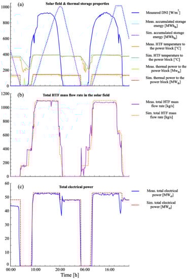 El Hefni et al. [] demonstrated a dynamic model of PTPP operating with synthetic oil and DSG linear Fresnel hybrid CCPP using DYMOLA software. Thereafter, forecasts based on the experimental data were verified. The objective of the present approach was to reduce uncertainties in the annual power generation estimates. Xu et al. [] introduced a dynamic approach that considers the accumulative influence of solar irradiation. This approach was applied successfully during various disturbance situations (such as DNI and demand changes). Janotte et al. [] explained the capacity of a PTC loop based on transient constraints. A steady-state approach was used for the comparison of the data obtained for approximately one year. Xu et al. [,] designed a dynamic simulation model to complete the static testing methodology of the conventional state. Real experiments to test the outdoor conditions were conducted on a wide scale. Mathematically, this model relies on the energy equilibrium of the main elements of the PTC and unsteady procedures under different conditions, such as changes in the solar radiations, incident angle, HTF mass flow, and HTF temperature at the entrance. In addition, two assumptions were applied within that model: firstly, the temperature of absorption tube is uniform; secondly, a relative error of less than 2% should be present in the operating temperature range and the differences in the volume flow. Mosleh et al. [] modelled and validated a dynamic mathematical collector model depending on the photo-thermal conversion process of PTPP. Combining the verified model with pumps, oil/water heat exchanger, and other existing models, a parabolic trough solar field technology is implemented on the simulation platform. Boukelia et al. [] presented the artificial neural network algorithm (ANN) with a feed-forward back-propagation learning algorithm and the Levenberg–Marquardt algorithm in order to analyze and improve the technical and economic performance of two PTPPs combined with a thermal storage system and fuel back-up system. The first power plant uses thermal oil as a heat transfer fluid, while molten salt is used in the second power plant. The best designs of both PTPPs are found in the analysis of levelized energy cost using the obtained weights and biases of the best artificial neural network algorithm topology. The technical and economic potential of both plants were compared based on hourly and annual performances. The comparison shows that the annual energy production and capacity factor of the molten salt power plant increases by about 26 % compared to the thermal oil power plant, due to the difference in the transmission of thermal power methods and the aperture area of the solar collector. Moreover, the results indicate that the levelized energy cost of the first power plant (molten salt power plant) is reduced to approximately 13 % compared with the second power plant (thermal oil power plant). Biencinto et al. [] presented a quasi-dynamic model of a PTPP using the TRNSYS software environment. Direct steam generation technology was used in this power plant. The behavior of the solar field and the power block of a 38.5 MWel PTPP was analyzed by comparing the annual performance of the suggested strategies (sliding pressure and fixed pressure strategies) regarding electrical power production. Both strategies are applied in the PTPP with direct steam generation in order to control the steam pressure. The comparison displays that the sliding pressure strategies are more efficient in terms of net electrical power production than the fixed pressure strategies. Al-Maliki et al. performed some studies [,,,,,,] in which the 50 MWel Andasol II power plant was also modelled using APROS software with all required automation circuits. In addition to the solar field, a thermal storage system operated with molten salt and a detailed dynamic model of the power block were also carried out in this study. After achieving the model validation, it can be observed that the thermal energy storage provides an almost constant thermal power to the power block, despite small fluctuations in DNI, as shown in Figure 4. Moreover, the power plant is capable of continued power generation for 7.5 h after sunset, due to thermal storage []. Detailed dynamics modelling and simulation were carried out for the 50 MWel Andasol PTPP in Spain. A comparison between measured data and simulated results for a single day during strong cloudy days shows good agreement in the period between 9:55 and 17:14. The differences after this period are due to the unknown behavior applied by the operator in particular. As a result of the optimization of the operating strategy, the generation period of electrical power output is improved by around 26% compared to the reference power plant [].