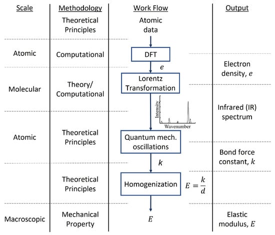 where is the equilibrium bond length in m, k is the bond force constant in N·m and E is the Young’s modulus in GPa. Therefore, using Equation (7) in combination with (8), the Young’s modulus of gas hydrates can be established from its infrared spectrum, specifically its hydrogen bond force constant [,]. Figure 1 shows a schematic of how theoretical and computational methods integrate a multiscale approach to characterize the material properties of gas hydrates.