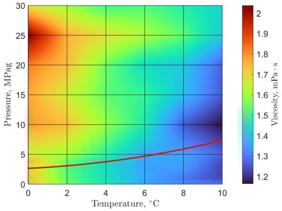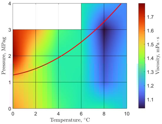 Rheological phase diagram of carbon dioxide gas hydrates: the viscosity of pre-nucleation and early hydrate formation systems overlayed with the three-phase hydrate-liquid-gas equilibrium line (red line); equilibrium data from Carroll in Natural Gas Hydrates []; figure adapted from Guerra et al. [].