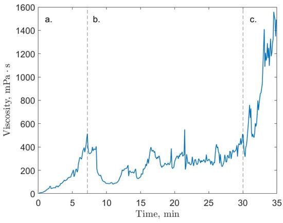 An example of the three stages of gas hydrate growth as characterized by the system’s viscosity; carbon dioxide test run at 2 °C and 30 MPag; (a) initial growth, (b) slurry stage, (c) final growth; figure adapted from Guerra et al. [].