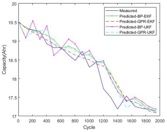 Table 2, the results based on GPR operation have higher accuracy when using capacity test data. For the prediction algorithm, UKF and EKF have similar effects. The accuracy of EKF is slightly higher in this experiment.