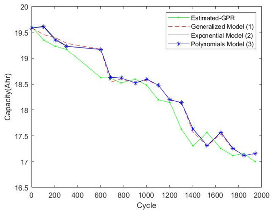 Determining the form of the battery performance degradation model is challenging due to the complex battery deterioration mechanism. Results from the data-driven GPR method are largely independent of the original model form and determined by the test data, as confirmed in this work. Three commonly used battery life decay models predicted by EKF used the generalized, exponential and polynomials models and were tested, producing the results shown in
