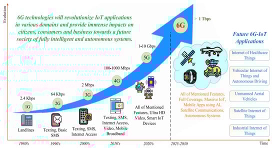 A range of technologies that need to be described for the full-scale development of the 6G communication network. The study of Liu et al. [] highlighted different technologies that can be useful in 6G wireless communication. These technologies include the Internet of Things (IoT), virtual reality (VR), Terahertz (THz) communication, visible light communication, etc. IoT is also discussed by Liu et al. [], who states that the current state of communication networks, i.e., 5G, is relatively slow at keeping the billions of devices connected to IoT systems, as they require massive data processing and communication in real-time. As a result, scientists are already looking forward to a faster form of communication that can open up a new era in terms of connectivity.