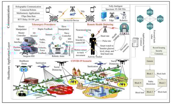 Fog computing is a cloud-computing combination of routers, storage data and computers with end-users in close proximity. Moreover, connected robotics and autonomous systems are also an application of the 6G wireless communication network. The 6G could be useful in the deployment of connected robots and autonomous systems, such as drone-delivery UAV systems. The 6G communication system employing robotics and autonomous systems promotes self-driving cars and improves traffic and driving patterns using the sensors. A wide range of sensors is used in 6G wireless communication, including Light Detection and Ranging (LiDAR), radar GPS, sonar and odometry and inertial measurement units. When using 6G wireless communication such as UAV, there is a system communication between the ground-based controller and systems communications []. Furthermore, the AI application of the 6G wireless communication can be useful in providing smart healthcare systems with health monitoring and precision medical treatment. It also supports privacy and a high-level protection and support system for healthcare workers, professionals and patients, thus maximizing the advantages of its application [].