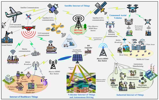 6G wireless communication can also provide haptic communication, as it is a nonverbal communication medium that employs the sense of touch. This is extremely useful for remote users, as they can experience haptic communication and interaction in the real world. The superior features of the 6G application are useful in haptic communication in smart cities among the members and individuals. Similarly, a 6G wireless communication network can be applied in industry for manufacturing and automation purposes. By providing full automation to provide secure communication and interaction mediums, 6G wireless communication can ensure high-data-quality transfer that is nearly error-free. Another significant aspect of employing a 6G system is data transfer without any data loss when transmitted and received by the end-user []. Hence, the application of IoT devices is revolutionizing the people’s lives through the new state-of-the-art, i.e., 6G wireless communication in smart cities.