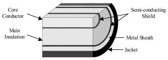 Typical structures of power cables mainly include the single-core structure and the three-core structure. The single-core structure, as presented in Figure 1, is taken as an example to study in the paper.