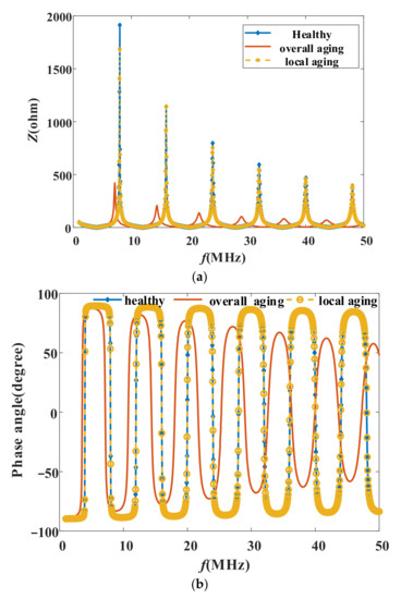 As presented in Figure 11, there is a clear distinction between both impedance magnitude and phase spectroscopies for healthy and overall aged states. For the impedance magnitude spectroscopy, as shown in Figure 11a, the distinction is mainly reflected in the characteristic frequency and impedance; the characteristic frequency and corresponding impedance magnitudes change with the aging degree. For the impedance phase spectroscopy, as shown in Figure 11b, the distinction is mainly reflected in the periodicity observed in the curve. As the aging degree increases, the phase-angle change period and the amplitude also change. It is to be noticed that the phase-frequency period of the impedance spectroscopy becomes shorter as the aging degree increases, meaning that excessive aging will affect the appropriate frequency range of the impedance spectroscopy. However, the degree of aging is not known before the measurement, and the probability of serious overall aging is also very low; the selection of the frequency range does not change due to the different degrees of aging.