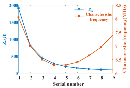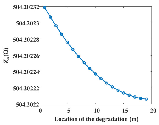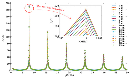 It is to be noted that the reference frequency, fre, decreases with the length of the line. The frequency range of the impedance spectroscopy will also be smaller for longer cables. Thus, the distinction of Zm also decreases with the length in Figure 7, which indicates that the measurement resolution of the impedance should increase with the length.