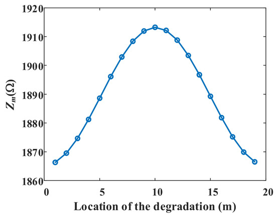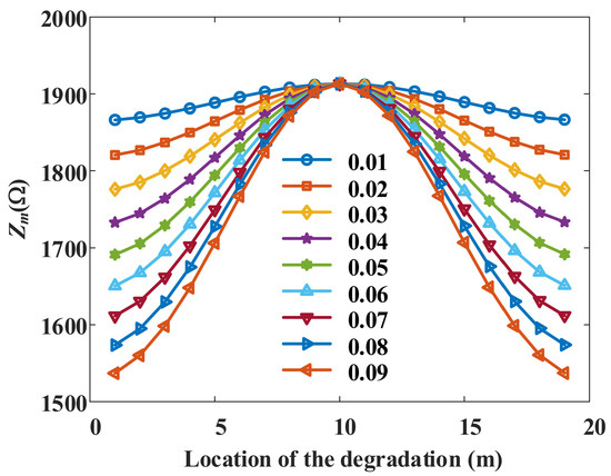 As presented in Figure 9, the size of the degradation mainly affects the scale of the relationship curve of Zm and the location of the degradation. As the physical size of the degradation increases, the curve becomes steeper; in the meantime, it becomes easier for the location. The same as in Figure 8, the position of the degradation can be deduced by the Zm value, but this approach also produces a false solution that is symmetric about the midpoint. More discussions can be found in Section 5.