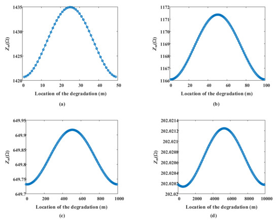 In Figure 6, the impedance first increases and then decreases with the distance of the degradation, and the maximum value appears at the midpoint. Simulations were also carried out for longer cables, at lengths such as 50 m, 100 m, 1000 m, 10,000 m, and still with a resolution of the degradation point of 0.1 mm. The results are shown in Figure 7.