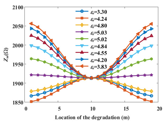 In order to show the effect of aging more comprehensively, the parameters in Table 2 are slightly exaggerated. It is to be noted that the value of tan δ increases with the increase of the ε parameters, while the relative permittivity does not, meaning that the real and imaginary parts of the permittivity do not vary linearly with the ε parameters. This is not common in practice. The aging in engineering practice tends to have a greater impact on the imaginary part of the permittivity; that is, the higher the aging degree, the greater the value of tan δ and the greater the value of the relative permittivity. In the simulation, extreme cases where the value of tan δ and the value of the relative permittivity do not change synchronously are also considered. In Figure 8, if the value of tan δ and the value of the relative permittivity change synchronously, the relationship curve of Zm and the location of the degradation shows an upwardly convex; otherwise, the curve is downwardly concave. In general, the position of the degradation can be deduced by the Zm value, but this approach produces a false solution at around midpoint, due to symmetry. Experienced engineers can make further judgments based on the actual situation on site, such as water soaking, skin damage, corners, etc. More discussions can be found in Section 5. It is also to be noted that the impedance symmetry around the midpoint also appeared in Figure 8. Mathematically, this is due to the piecewise calculation method used in the paper, as shown in (12) and (13). Another explanation is that the impedance of the cable exhibits extreme values at the characteristic frequency. For local aging, if the position is just at the midpoint of the cable, and the impedance measurement position is at the front end, the distance from the front end to the midpoint of the line for one reflection would be exactly the complete line length. In this case, the first half is in a healthy state and has nothing to do with the degree of aging; the impedance at the characteristic frequency of the special position is also independent of the degree of aging.