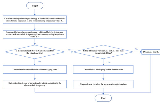 The results presented in Section 3 indicated that the impedance spectroscopy, especially the characteristic frequency, can be used for the diagnosis and location of cable aging and deterioration. The procedure of diagnosis and location of general aging and local deterioration can be summarized as shown in Figure 10.
