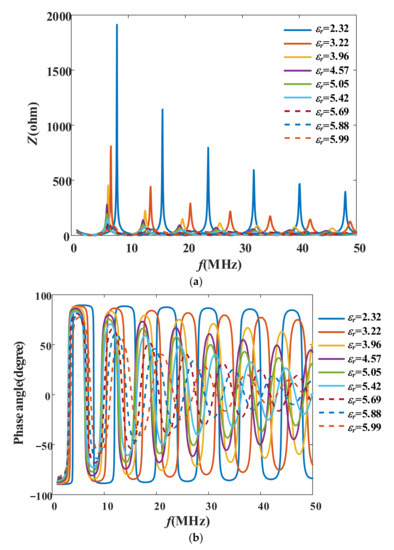 Firstly, the impedance spectroscopy of the healthy globally aged and locally aged cables at the power supply side were calculated in the range of 1 to 50 MHz. The fitting parameters (Equation (11)) for the healthy cables are, respectively, A = 2.68, B = 0.14, and p = 0.02. Namely, the relative permittivity is about 2.3, and the value of tan δ is about 4.3 × 10−3. Meanwhile, the fitting parameters for the aged cables are, respectively, A = 4.26, B = 0.22, p = 0.05, and la = 10 and lb = 10.01. According to (6), the impedance spectroscopy for healthy and aged cables at the position of x = 0 can be presented in Figure 4; the simulations were carried out by using MATLAB.