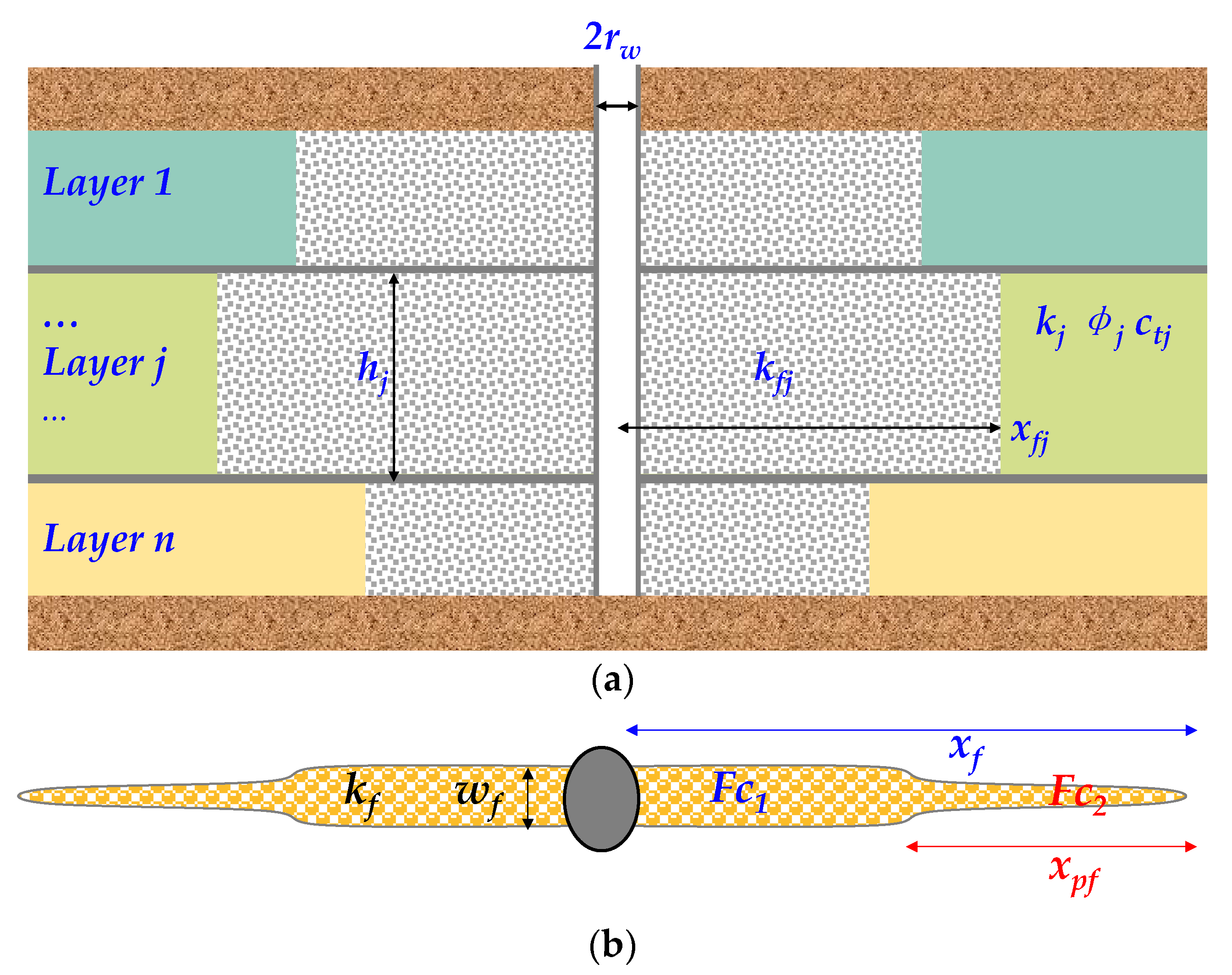- An MLVF commingled production well is located in a tight gas reservoir. Each layer has an individual constant thickness (hj), and vertical fracture length (xfj);
