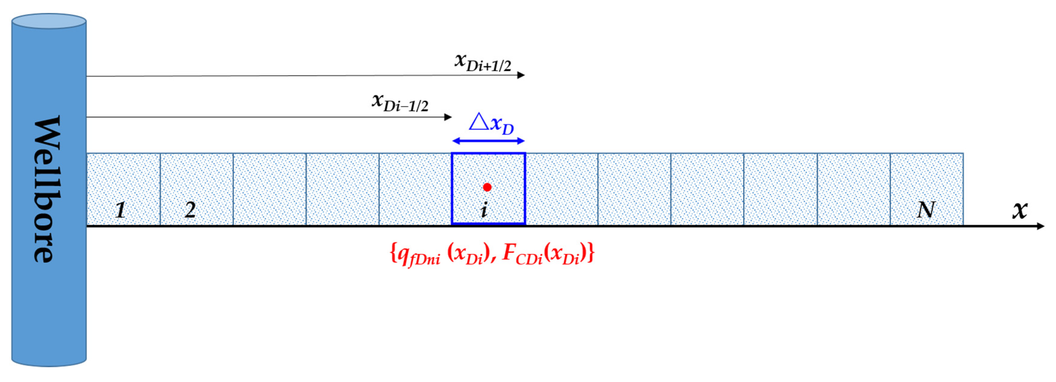- As shown in Figure 1b, the fracture width (wf) and fracture conductivity (Fc) is decreased from the wellbore to the toe of the fracture. In detail, the nearby fracture has higher conductivity (FC1) and more width than the further fracture. The further fracture has poor conductivity (FC2) and a smaller fracture length (xpf);