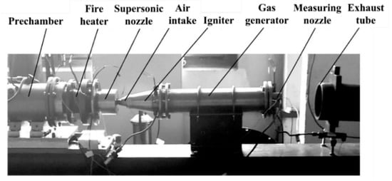 Figure 1 shows the general view of a free jet facility for testing a GG in supersonic flow of gasifying agent (air). The facility was based on the Model Aerodynamic Facility (MAF) at the ITAM SB RAS [28]. Compressed air from high-pressure cylinders passed through a prechamber and entered a fire heater operating on combustion of hydrogen to obtain a hot air. Mass flow rate of hydrogen to the fire heater varied from 2 to 4 g/s. Apart from air and hydrogen, oxygen was added to the air flow in an amount of 20 to 40 g/s for keeping the mass fraction of oxygen at 23%wt in the vitiated air outflow. Thus, the outflowing gasifying agent contained oxygen (23%), nitrogen (75%), and steam (2%). The change in thermophysical properties of air due to steam admixture was neglected.