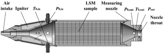 Figure 2 shows the schematic of the GG. An axisymmetric cylindrical intake with a diameter of 15 mm and length of 46.6 mm was installed in the frontal part of GG. From the cylindrical intake, hot gasifying agent flowed through a conical diffuser to enter the LSM sample. In the diffuser, a total pressure sensor and thermocouple were installed, which measured the stagnation pressure P0,in and stagnation temperature T0,in in the gas flow at the inlet to the LSM sample. Around the diffuser, a 36-g pyrotechnic igniter with a calorific value of about 1.5 MJ/kg was placed. It was used to ignite combustion of LSM aimed at providing heat for endothermic physical and chemical processes accompanying sample gasification. The igniter was triggered at a preset time by a command of the synchronization system. Typical igniter burning time was 0.10–0.15 s. Preliminary estimates showed that the gas temperature at the inlet of the LSM sample could theoretically reach 1300–2600 K, however the actual measured gas temperature was on the level of 1300–1500 K, thus indicating large heat loss into the walls.