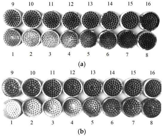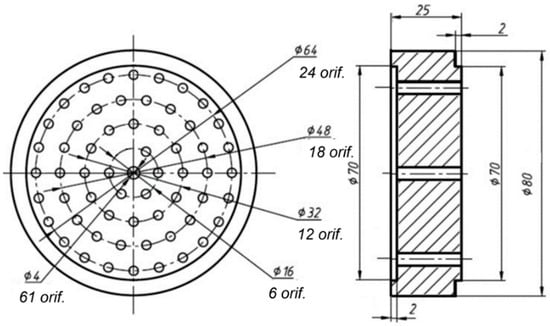 The LSM sample was assembled from 16 identical polypropylene (PP) blocks 80 mm in diameter and 23 mm long (Figure 3). Each block had 61 orifices with a diameter of 4 mm. When assembling the sample, the orifices of all blocks were aligned to form straight longitudinal channels. The total initial sample mass was 1.28 kg. The masses of each block and sample in assembly were measured by balances both before and after test fires with an error of 0.05 g.