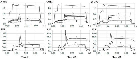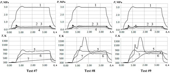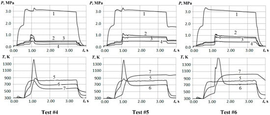 All test fires were conducted with igniter triggering. However, combustion of LSM sample failed in some test fires. Figure 4, Figure 5 and Figure 6 show the typical pressure and temperature records in test fires without and with combustion of LSM samples. In test fires without combustion (tests 1, 4, and 7 in Figure 4, Figure 5 and Figure 6), after ignition triggering, all measured parameters returned to their original values. In this case, the measured sample mass before and after test fires showed virtually no LSM depletion. In test fires with combustion (tests 2, 3, 5, 6, 8, 9 in Figure 4, Figure 5 and Figure 6), the pressure at the LSM sample inlet and outlet after ignition triggering sharply increased by a factor of 1.5 to 2.0. The temperature at the sample outlet increased to 800–1000 K, although the temperature at the sample inlet corresponded to the temperature of the incoming gas flow and remained constant at 600–700 K. This indicated the existence of an exothermic oxidation process due to partial interaction of PP decomposition products with oxygen in the incoming flow of gasifying agent.