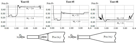 In test fires without combustion, a cylindrical GG intake cut out a stream of a cross-sectional area Fin with the Mach number M1 from the free jet emanating from the facility nozzle. In this case, the contraction ratio of the GG intake was φ = 1.0. Let us jointly consider Figure 2 and curves 2 (P0,in) in tests 1, 4, and 7 in Figure 4, Figure 5 and Figure 6. Downstream of the cylindrical section of the intake, the supersonic gas flow entered the expanding conical diffuser and accelerated to Mach number M2 (M2 > M1). Thereafter, due to geometric throttling in the LSM channels, the flow passed through a normal shock and became subsonic with a sharp decrease in the stagnation pressure to P0,in(M2).