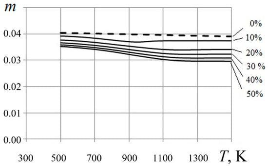 Calculated dependences of coefficient m on temperature for PP–air mixtures with different content of PP (mass basis) at pressure 1 MPa.