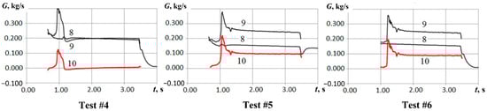 Calculated time histories of flow rates Gin (curve 8), Gout (9) and ΔG = Gout(t) − Gin(t) (10) at M1 = 2.94 in tests 4 to 6.