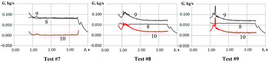 As mentioned above, LSM combustion in tests 1, 4, and 7 was absent. Therefore, the flow rates Gin and Gout were virtually equal. In test fires with combustion, a noticeable LSM gasification accompanied with sample combustion was detected. In these latter test fires, the gas flow rates Gin and Gout differed markedly. According to Figure 9, Figure 10 and Figure 11 the flow rate of gasification products (ΔG = Gout(t) − Gin(t)) in test fires with combustion could be constant, like in Figure 9 and Figure 10, or variable in time, like in Figure 11. The mean values of the flow rates of gasification products in Figure 9, Figure 10 and Figure 11 took the values of 0.08 kg/s at M1 = 2.43, 0.10 kg/s at M1 = 2.94, and 0.05–0.02 kg/s at M1 = 3.81.