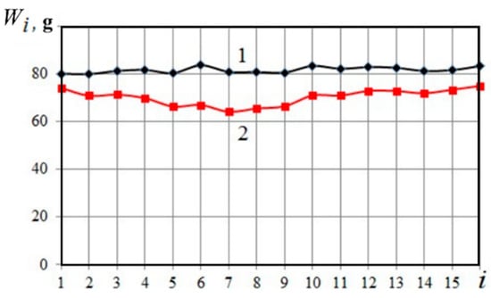 An important element of test data processing procedure was the determination of LSM sample mass before (W1) and after (W2) test fire. The difference between these masses (ΔW = W1 − W2) determines the amount of gasified sample material leaving the GG with exhaust gases. Based on the calculated flow rates Gin and Gout and measured sample masses W1 and W2, one can derive the following balance equation for determining the intake contraction ratio φ: