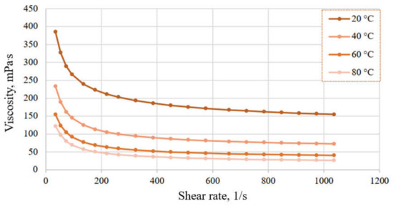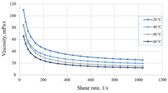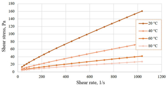 Rheological parameters of the formate-based drilling mud treated with PHPA were investigated at different temperatures (20 °C, 40 °C, 60 °C, 80 °C) with a rotary viscometer “Rheotest RN 4.1”. The rheological behaviour of the studied solution at different temperatures is shown in Figure 2 and Figure 3.