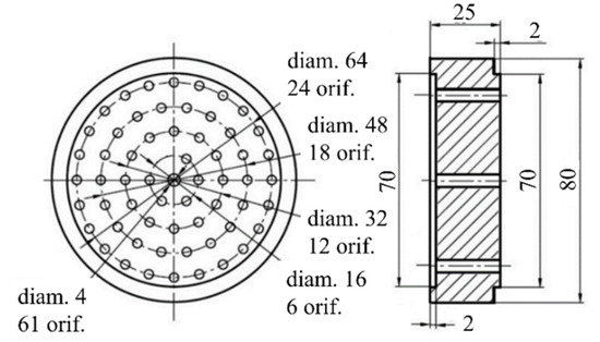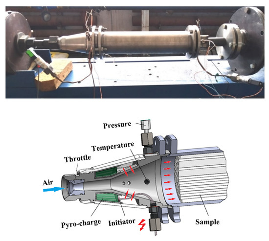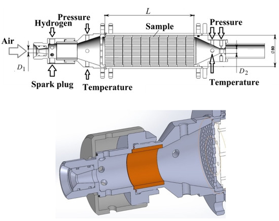 Figure 3 shows a schematic of GG with hydrogen-assisted ignition. Air from the MAF enters the GG through a throttling insert with throat diameter D1. Downstream of the insert, a provision is made for a fire heater operating on combustion of hydrogen to increase the temperature of the incoming air up to ~1700 K for a short time (~0.5 s). The hydrogen–air mixture is ignited with a spark plug. The mass of hydrogen used for ignition was less than 2 g. The inner cavity of the fire heater is partly covered with a heat-insulating insert. Polypropylene (PP) was used as LSM as it is gasified without formation of liquid phase (condensate). As will be shown later in this article, the approach developed herein was based on gas dynamic relationships that are not generally applicable to the two-phase flows containing liquid or solid particles. A PP test sample was placed in the combustion chamber of the GG in the form of 16 blocks with a diameter of 80 mm and a length of 25 mm connected in series (Figure 4). Each block had 61 holes with a diameter of 4 mm.