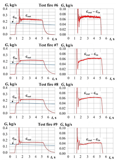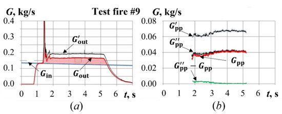 Figure 13 and Figure 14 show the time histories of gas mass flow rates at GG inlet, , and outlet, , as well as the mass flow rates of gasification products, , calculated based on experimental data for test fires #4 and #5 with pyro-charge assisted ignition. For calculating , , and , the procedure described in Section 3 was used. In test fire #4, ignition is not activated. As a result, the mass flow rates of gas (air) at GG inlet and outlet are nearly the same. The difference in mass flow rates does not exceed 1 g/s. In test fire #5, despite the activation of pyro-charge ignition, a PP sample is not ignited. The total yield of gasification products is virtually zero, except for a small amount generated during pyro-charge ignition. In this test fire, a decrease in sample mass by about 10 g is detected.