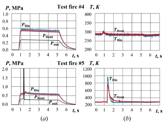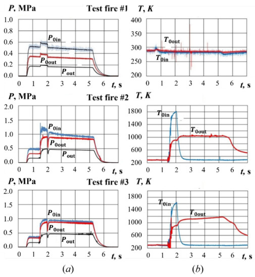 In test fires, gas flow parameters were recorded both upstream and downstream of the PP sample. The measured parameters upstream of the PP sample included the stagnation pressure in the facility storage vessels as well as gas flow total pressure and temperature at the inlet to the combustion chamber of the GG. The measured parameters downstream of the PP sample included the total pressure and stagnation temperature provided by pressure sensor and three tungsten–rhenium thermocouples upstream of the sonic nozzle at GG outlet. In addition, a static pressure sensor was placed in the nozzle throat, which allows measuring the static pressure to control a local flow Mach number.