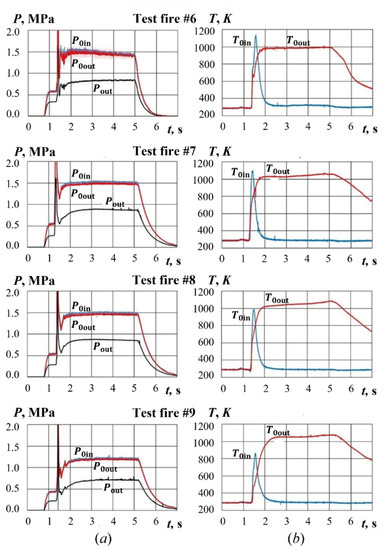 Figure 11 shows the typical time histories of gas pressure and temperature in test fires with the ignition, combustion, and gasification of PP sample. In test fires #6 to #9, after pyro-charge ignition, the gas temperature at sample inlet increases to 900–1100 K and the PP sample is ignited. As for the pressure, its values at sample inlet and outlet increase by a factor of 2.5–3.0. It is noteworthy that the pressures at sample inlet and outlet are virtually the same, which is indicative of the subsonic flow in sample channels with a low total pressure loss. After ignition, the temperature at sample inlet decreases to 290 K, whereas the temperature at sample outlet remains at 1000–1100 K until the shutdown of the air supply. The latter indicates the presence of PP sample combustion and gasification.