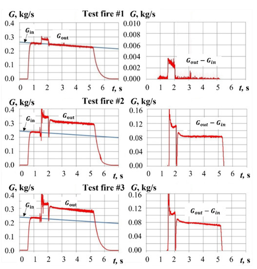 An important step in the data processing technique under consideration is the determination of the mass of PP sample before () and after () test fire. The difference between and , (), determines the amount of sample material converted to gas, which flows out of the GG in the form of gasification products. The comparison of gas mass flow rates at GG inlet and outlet with the change in the sample total mass allows writing a mass balance equation in the following form:
