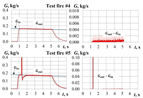 Calculated mass flow rates Gin(t), Gout(t), and Gout(t) − Gin(t) in test fires #4 and #5.