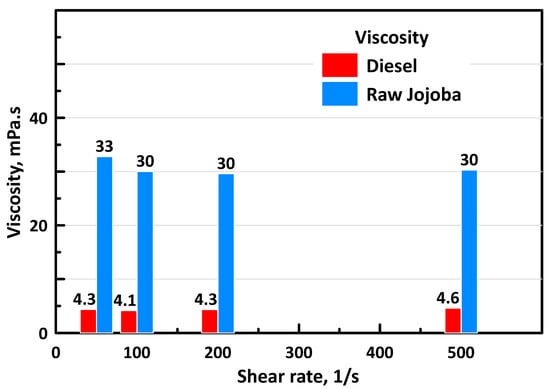 Viscosities of raw Jojoba oil compared to diesel at four shear rates, at 30 °C.