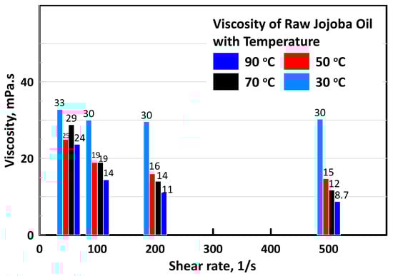 Viscosities of raw Jojoba oil at different temperatures.