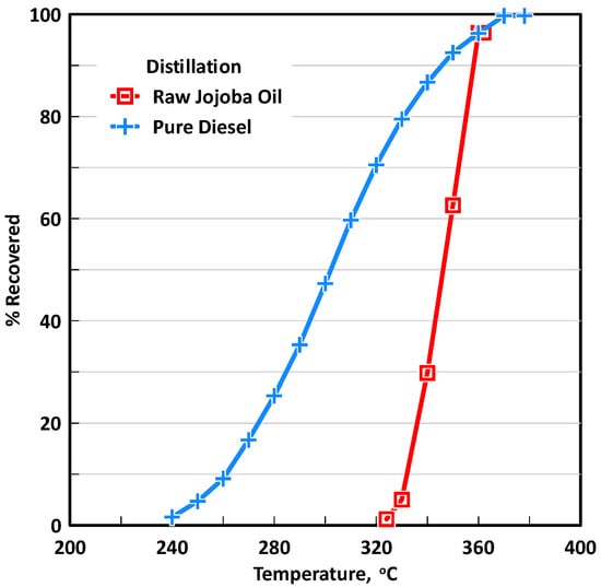 - Distillation temperatures for raw Jojoba oil were found to be almost similar to diesel although it had a narrower temperature window for boiling. The final boiling temperature for diesel was 378 °C while it was 362 °C for pure Jojoba oil.
