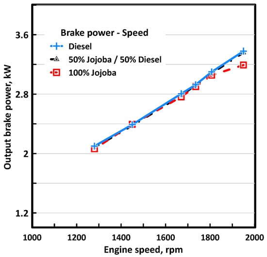 Brake power output versus engine speed for diesel fuel and raw Jojoba oil.