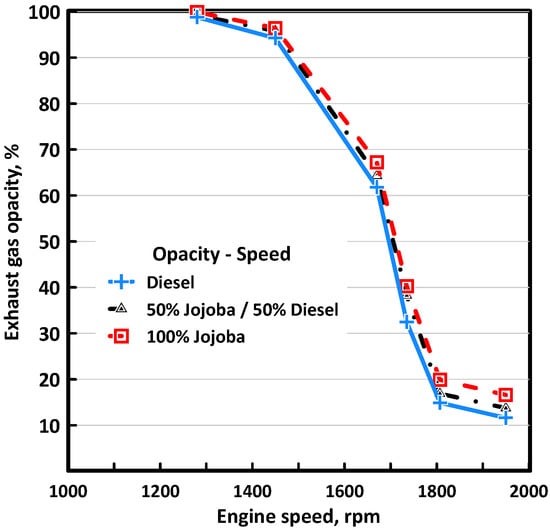Figure 6 illustrates the exhaust gas temperature against the engine speed for the three fuels. It may be seen from Figure 6 that the exhaust gas temperature for Jojoba fuel was slightly lower than the case for diesel fuel, e.g., at 1800 rpm engine speed, it was 323 °C for diesel fuel while it was about 310 °C for Jojoba case, which is 4% lower. This may be attributed to the slightly lower heating value of raw Jojoba oil as compared with diesel fuel; see Table 4.